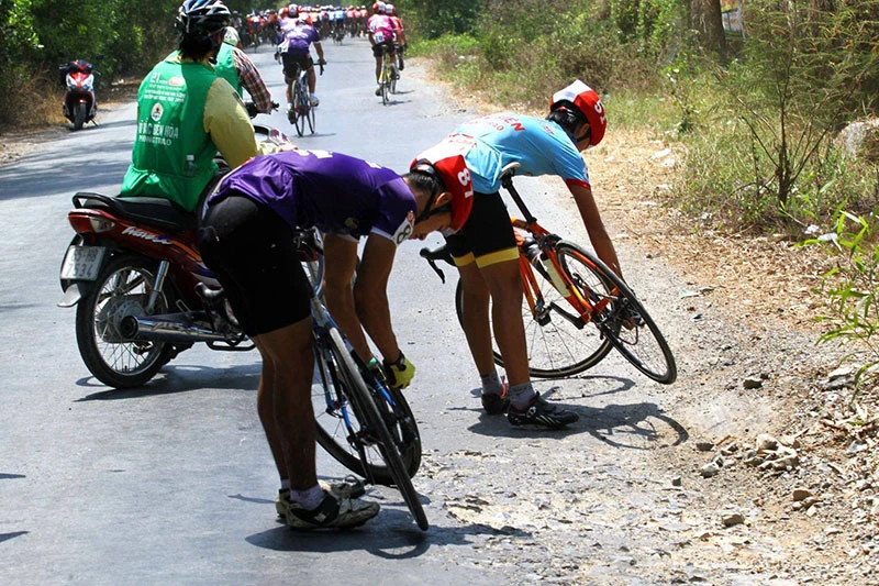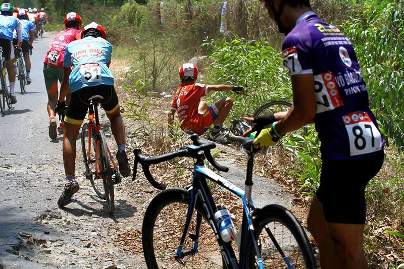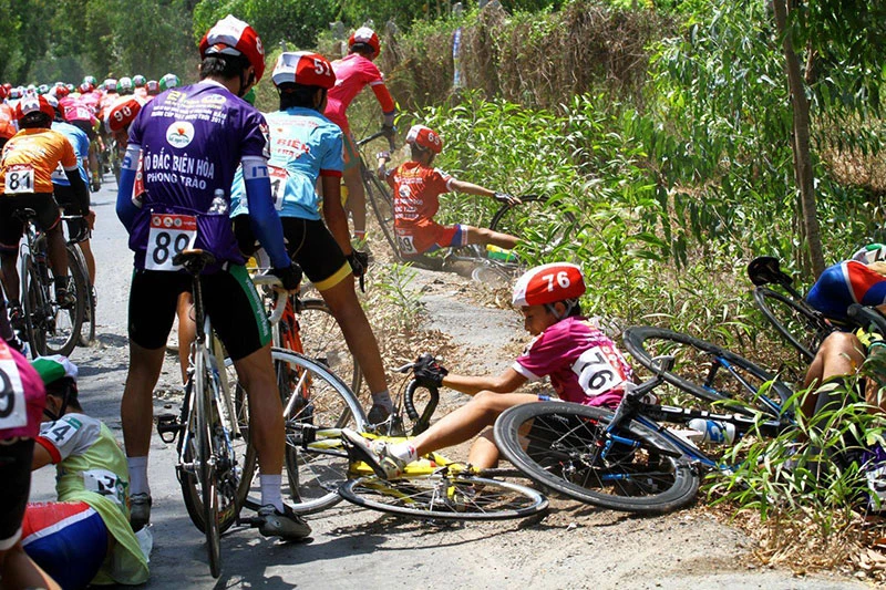 Tại các cuộc đua xe đạp, nguy hiểm luôn rình rập các tay đua trẻ thiếu kinh nghiệm. ẢNH: MINH TÂN