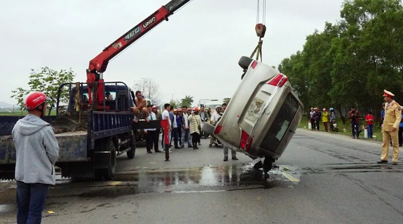 Cẩu chiếc xe hơi lật ngửa lên đường.