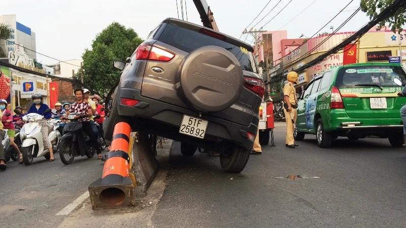 16 giờ chiều 20-5, xe ô tô bốn chỗ biển số TP.HCM (chưa xác định được danh tính tài xế) lưu thông trên đường Quang Trung theo hướng từ cầu Chợ Cầu về ngã 5 Gò Vấp. Khi vừa qua giao lộ với đường Lê Văn Thọ khoảng 300 m (phường 11, quận Gò Vấp) thì bỗng nhiên lao qua trái, tông gãy cột trụ phản quang đồng thời leo lên dải phân cách.