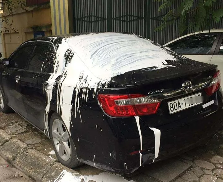 Theo anh G. (tài xế taxi), sáng nay khi anh chạy ra khu vực ngõ 118, thuộc đường Nguyễn Khánh Toàn để đón khách thì nhìn thấy một chiếc xe ô tô màu đen đỗ ở gần khu vực trường THPT Cầu Giấy bị dính đầy sơn trắng phía trên nóc.