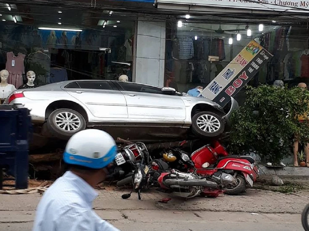 Thời điểm trên, xe ô tô 29A-872.xx đang di chuyển thì bất ngờ mất lái và đâm vào một cây bên đường. Tiếp đó, chiếc xe chồm lên vỉa hè rồi đè bẹp 4 chiếc xe máy đang dựng trước một cửa hàng thời trang.