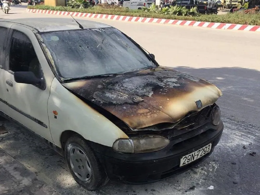 Hậu quả vụ cháy khiến phần đầu chiếc ô tô bị thiêu rụi, nắp capo bị hư hỏng nặng. Lửa cũng khiến khoang máy phía dưới bị ảnh hưởng.
