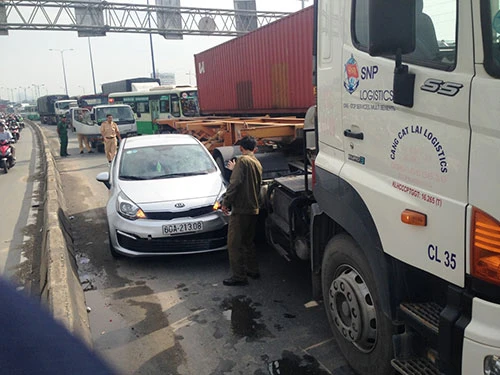 Cú tông mạnh đã khiến phần đầu chiếc xe tô bốn chỗ hư hỏng nặng, nhiều bộ phận văng tung tóe. Vụ va chạm đã khiến hàng ngàn phương tiện ùn ứ nối đuôi nhau hơn 1km trên Xa lộ Hà Nội.