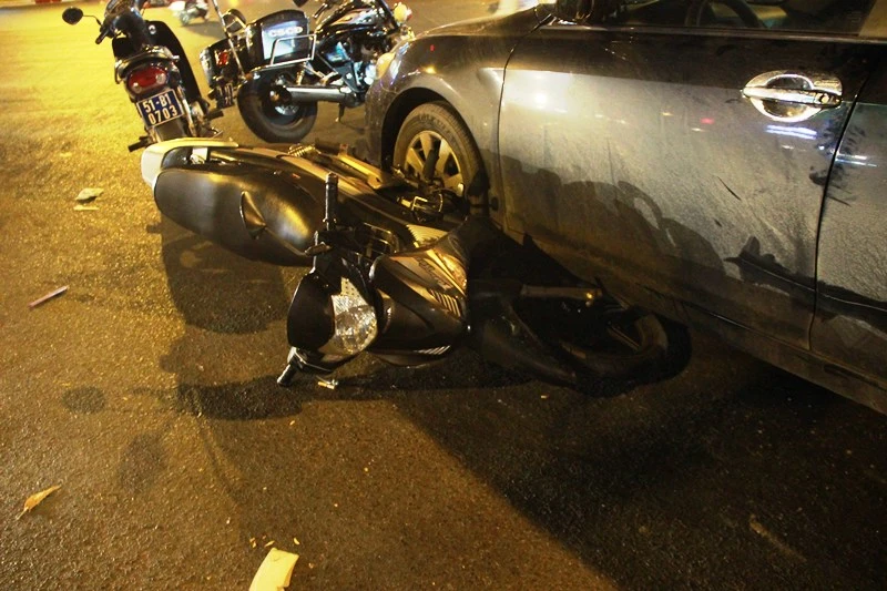Tại hiện trường, bốn xe máy nằm la liệt quanh ô tô, hư hỏng nhẹ.