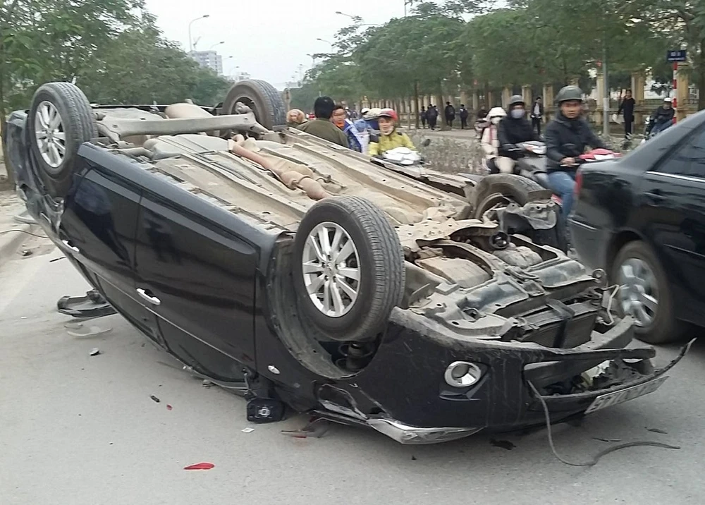 Chiếc xế hộp lật ngửa giữa đường. Ảnh: NAM GIANG