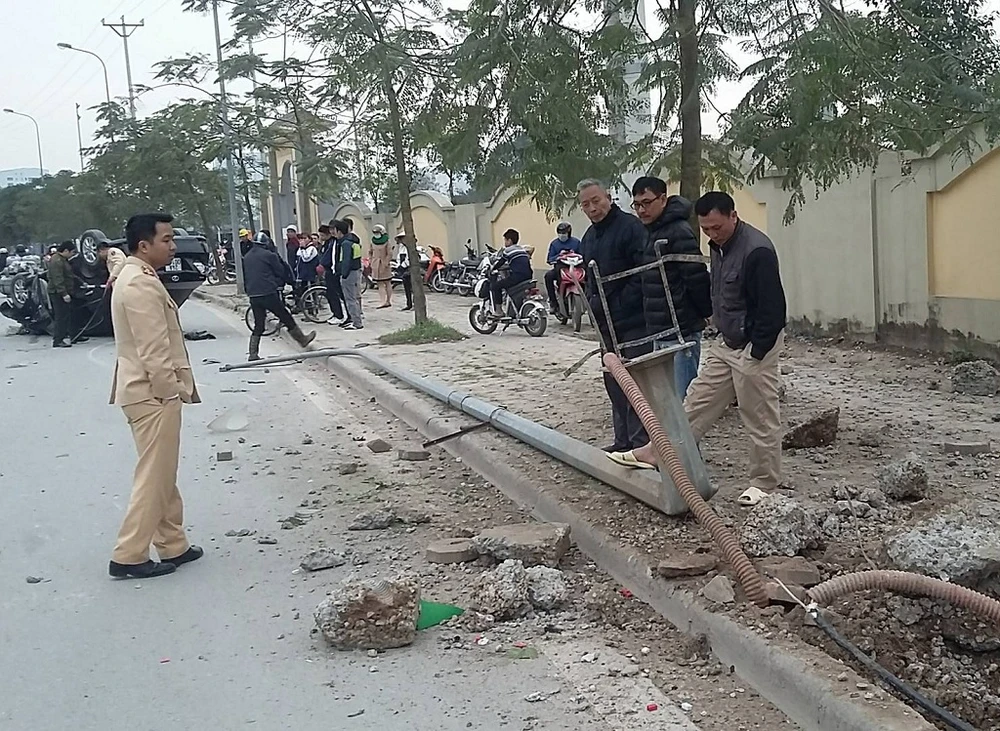 Chiếc xế hộp lao lên lề đường, đâm trực diện vào cột đèn cao áp bằng thép. Cú tông mạnh khiến cột điện bị gãy và bật tung khỏi lòng đất. Chiếc ô tô sau đó tiếp tục trượt một đoạn dài trước khi lật ngửa giữa đường.
