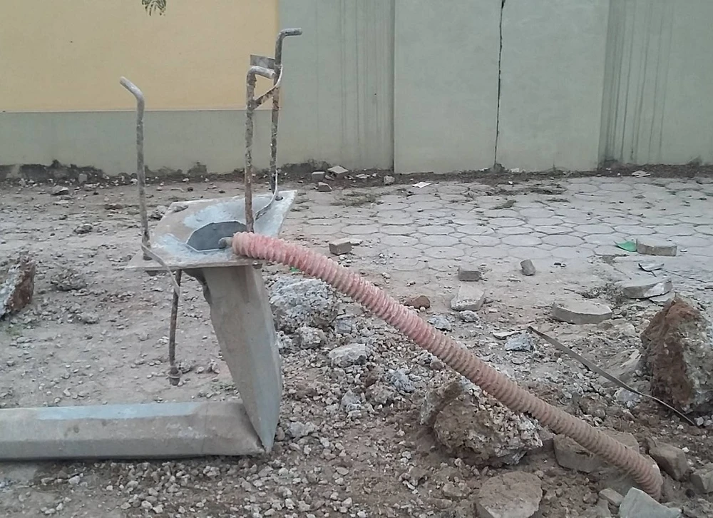 Cột điện bị tông gãy gục, bật khỏi lòng đất. Ảnh: NAM GIANG