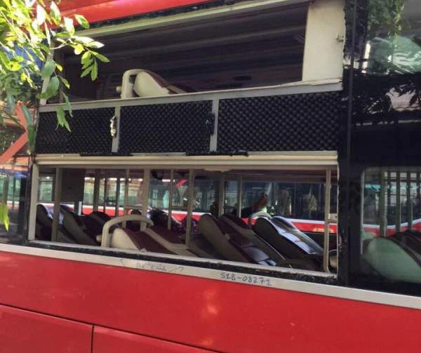 Kính bên hông phải nhà xe Thanh Tùng bị ném vỡ. (Ảnh do nhà xe cung cấp)
