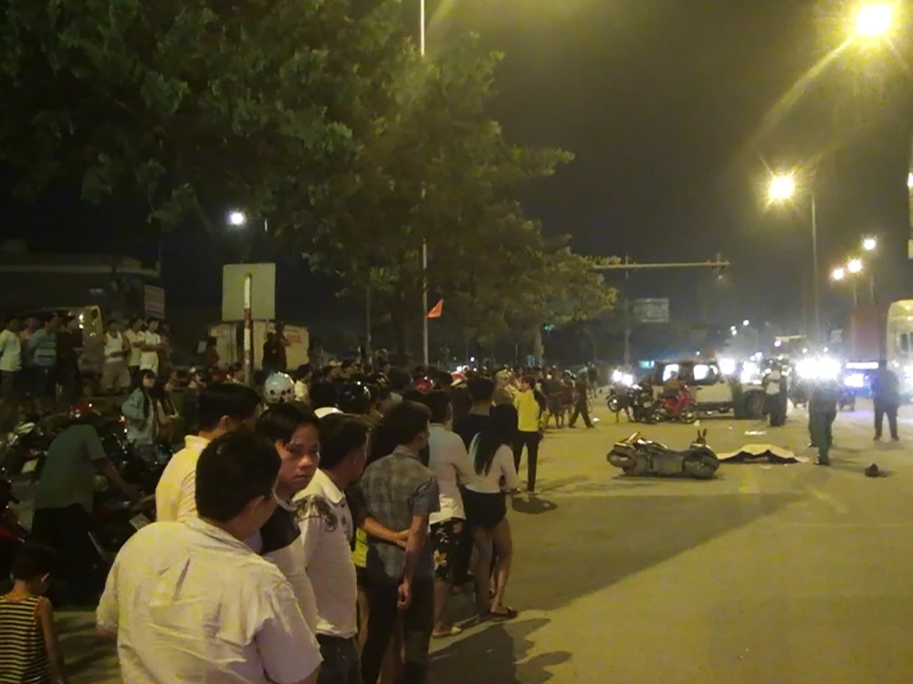 Tại hiện trường, thi thể người đàn ông nằm cạnh xe máy, cách đó vài mét là xe ô tô khách; trên đường có môt số vết cày xước, rất đông người dân theo dõi vụ việc.