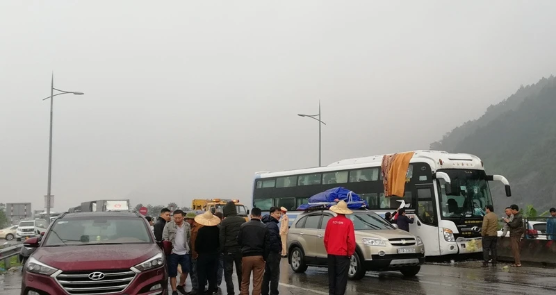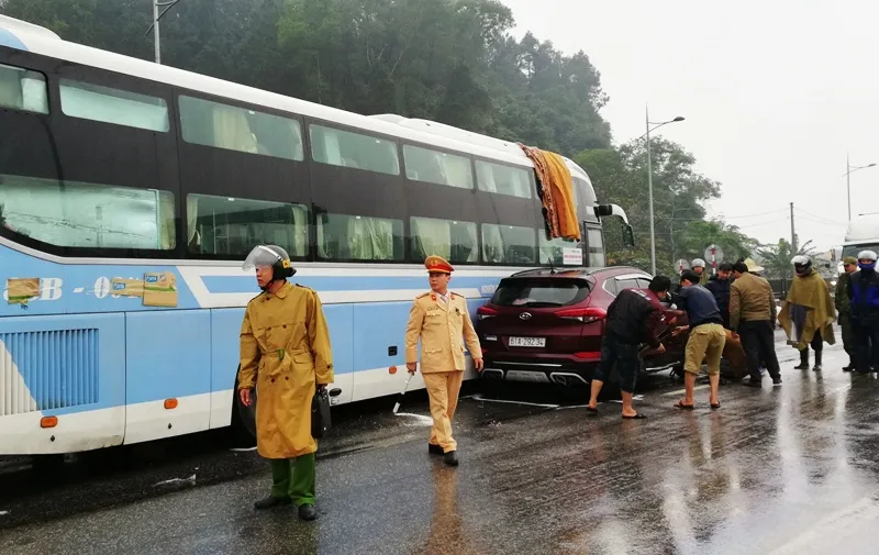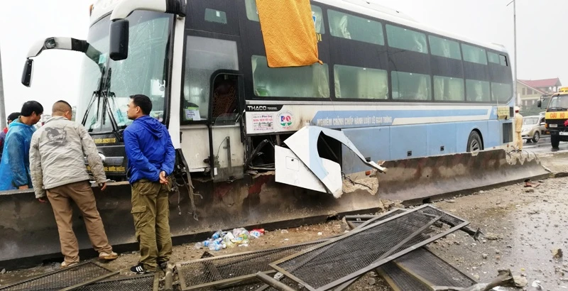 Cùng lúc đó, xe ô tô khách giường nằm của nhà xe Phú Quý mang BKS 38B-004.90 do anh Trần Văn Tiến (trú xã Quỳnh Phương, huyện Quỳnh Lưu, Nghệ An) điều khiển, chạy cùng chiều với tốc độ nhanh, tông vào dải phân cách đường và sườn trái xe ô tô con.