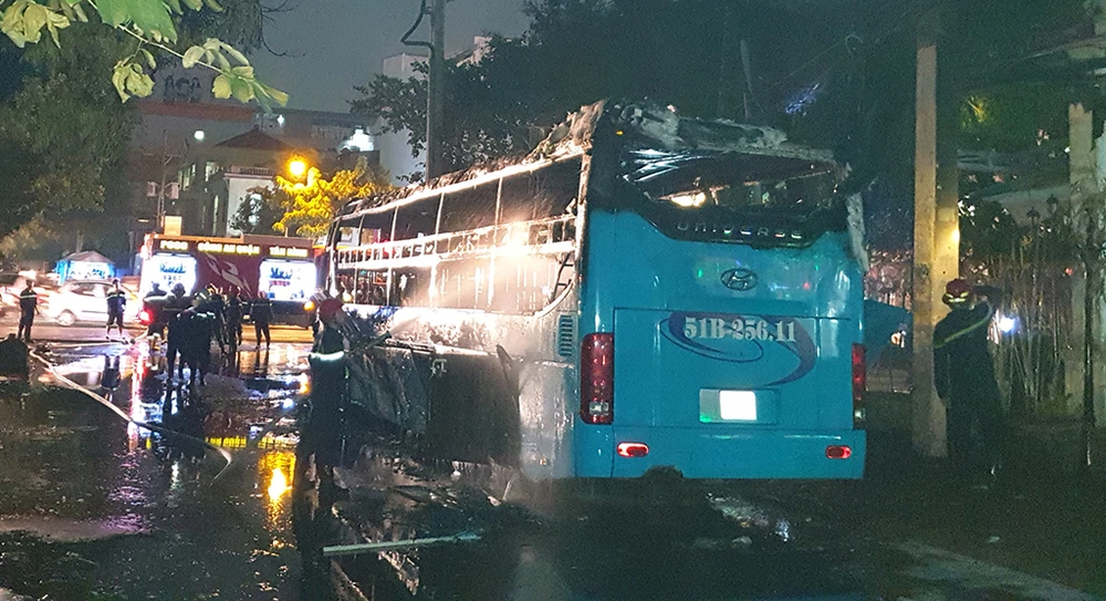Đến tối 14-1, lực lượng chức năng quận Tân Bình (TP.HCM) vẫn đang phong tỏa hiện trường, khám nghiệm, điều tra nguyên nhân vụ cháy xe khách xảy ra trên địa bàn.