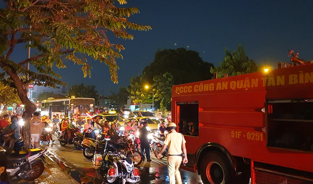 Sau vài phút, lửa bao phủ toàn bộ chiếc xe, lan lên đường dây cáp viễn thông thì cảnh sát PCCC quận Tân Bình điều động hai phương tiện cùng nhiều cán bộ, chiến sĩ có mặt khống chế.