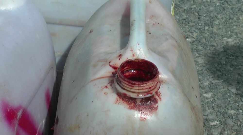 Huyết heo đựng trong các can nhựa vô cùng mất vệ sinh. Ảnh: QM