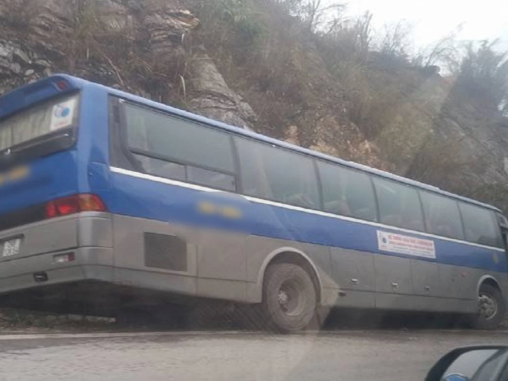 Tại hiện trường, chiếc xe khách do mất lái đã đâm sát vào vách núi. Toàn bộ tài xế, học sinh cùng những người trên xe không bị thương.