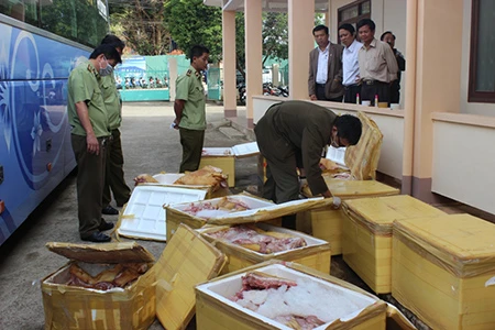 Ông Giao Thanh Tùng cho biết tại thời điểm kiểm tra, tài xế không xuất trình được bất cứ giấy tờ nào chứng minh nguồn gốc cũng như giấy kiểm dịch động vật của số thực phẩm trên. Toàn bộ thịt động vật được đựng trong 14 thùng xốp với trọng lượng 1.177 kg đang bốc mùi hôi thối.