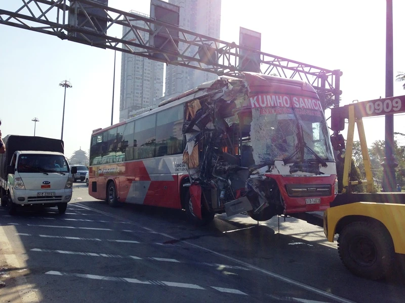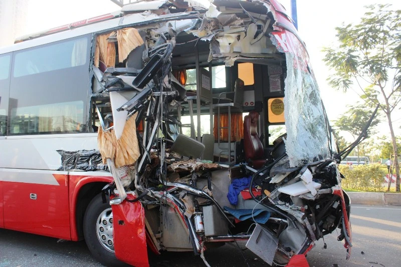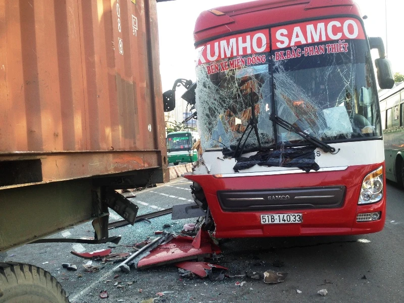 Vào khoảng 5 giờ 30 sáng 10-12, xe ô tô khách biển số 51B-140.33 của nhà xe Kumho Samco do tài xế khoảng 45 tuổi điều khiển chạy tuyến Bến xe Bắc Phan Thiết (tỉnh Bình Thuận) về Bến xe Miền Đông (TP.HCM). Khi đến xa lộ Hà Nội đoạn qua phường Thảo Điền, quận 2, TP.HCM thì tông thẳng vào đuôi xe container biển số 51C-708.23 chạy cùng chiều phía trước.