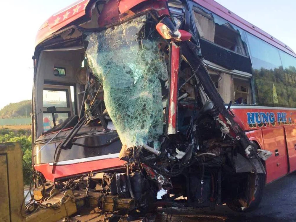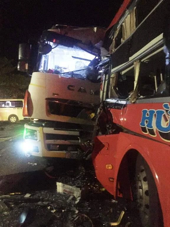 Vụ tai nạn khiến tài xế Phước tử vong tại chỗ. Tài xế Huy trên xe tải và 11 người trên xe khách biển số Nghệ An bị thương. Hai xe hư hỏng nặng phần đầu.