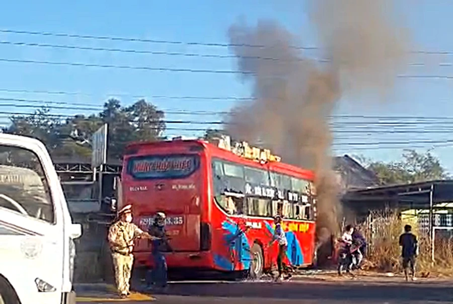 Xe khách bốc cháy phần đầu. Ảnh: PĐ