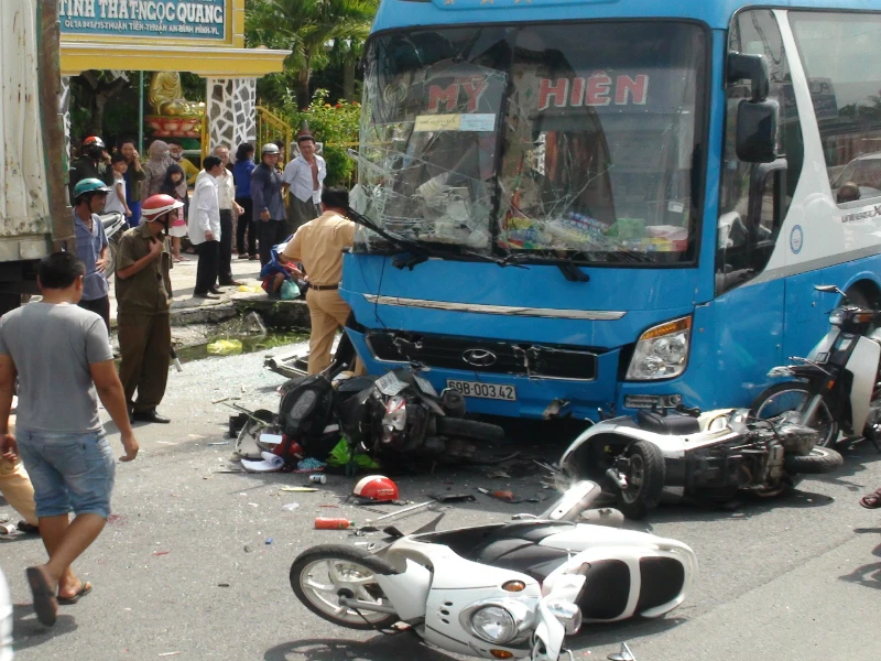 Chiếc xe khách tiếp tục lao về phía trước và tông vào 5 xe máy đang di chuyển trên đường. Cú tông liên hoàn khiến 2 người trên xe khách và 3 người chạy xe máy bị thương, phải nhập viện cấp cứu.