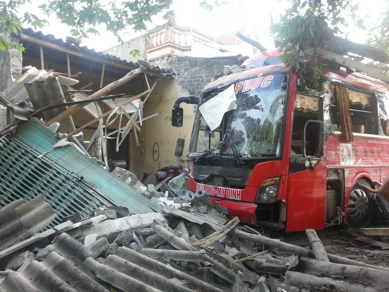 Xe khách màu xanh Bks 14b 01186 chạy hướng Quảng Ninh - Hà Nội bị móp phần đầu xe. Xe đỏ BKS 14b 00888, chạy hướng ngược lai sau khi va chạm bị mất lái hơn 50 m, sau đó lao đổ phần ngoài hai nhà dân bên đường.