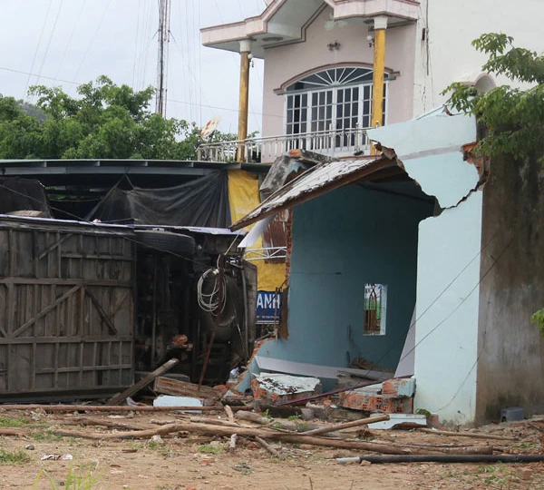 Chiếc xe khách tông vào hai căn nhà ven đường. Ảnh: CTV