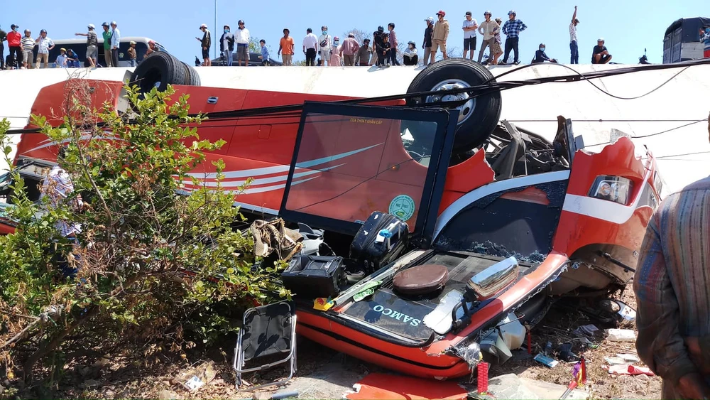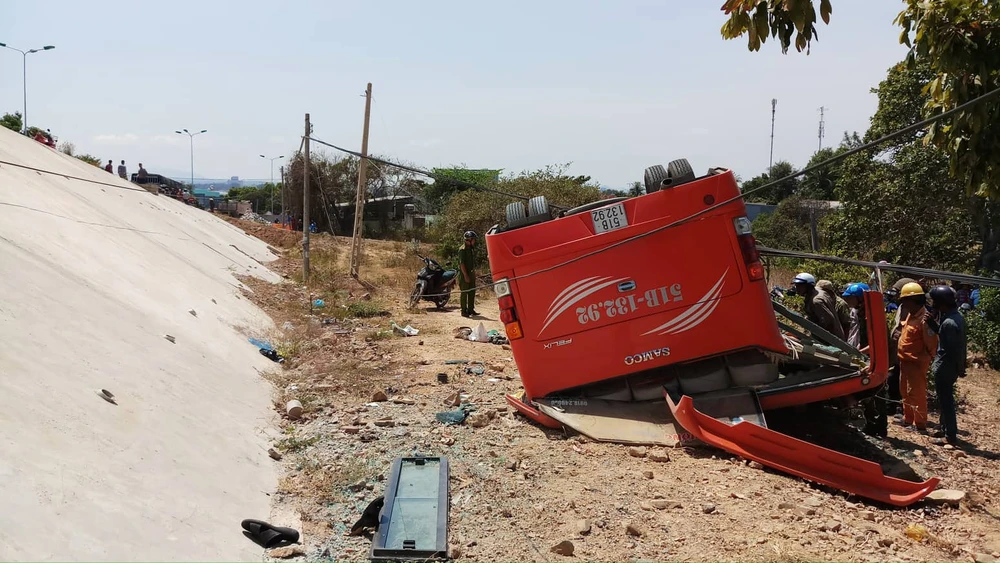 Theo thông tin ban đầu, xe khách hiệu Samco biển số 51B-132.92 chở du khách nước ngoài đi tham quan đã rơi xuống vực sâu ngửa bánh lên trời.