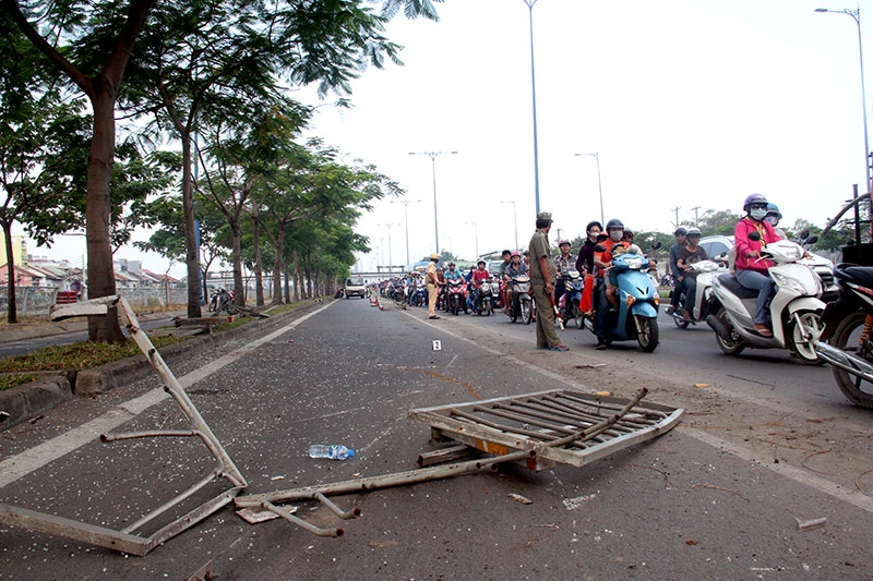 Tại hiện trường, hàng chục mét dải phân cách bị hư hỏng, biến dạng, kính xe vỡ văng tung tóe khắp nơi. Đầu xe khách cắm xuống dòng kênh. Lực lượng chức năng tiến hành phong tỏa một làn đường Võ Văn Kiệt để xử lý vụ việc. Giao thông qua khu vực bị ùn tắc.