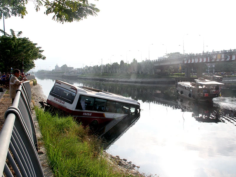 Khi vừa qua cầu Lò Gốm khoảng 400 m (phường 7, quận 6, TP.HCM) thì bất ngờ xe mất lái lao qua phải tông văng hàng chục mét dải phân cách rồi lao về hướng kênh Tàu Hủ, rơi xuống nước.