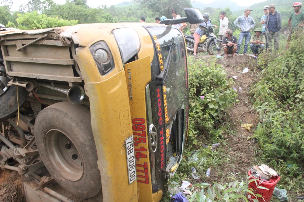 Chiếc xe khách rơi xuống vực khiến 10 người bị thương.