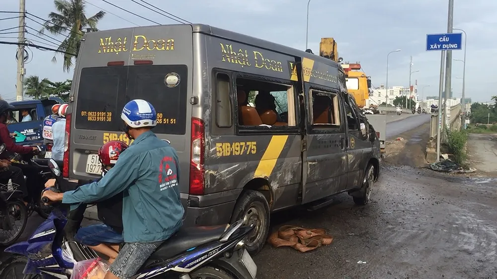 Đến chân cầu Xây Dựng thuộc phường Phú Hữu (quận 9, TP.HCM), ô tô này bất ngờ mất lái tông hàng loạt dải phân cách ngăn giữa hai chiều rồi lật nhào qua phải.