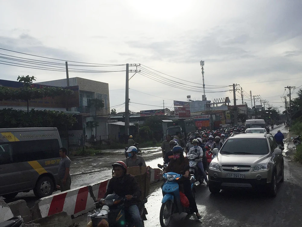 Ảnh hưởng từ sự cố khiến giao thông qua khu vực ùn ứ. Ảnh: H.Tâm