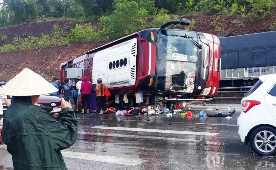 Vụ tai nạn xảy ra vào 17 giờ chiều 21-7, trên quốc lộ 1A (đoạn qua xã Nghi Yên, huyện Nghi Lộc, Nghệ An). Xe khách của nhà xe Quang Bắc mang BKS 22B-005.30 do anh Nguyễn Mạnh Hà (41 tuổi, trú phường Trương Trắc, TP Phúc Yên, Vĩnh Phúc) điều khiển, chạy hướng Hà Nội-TP.HCM, bất ngờ mất lái.