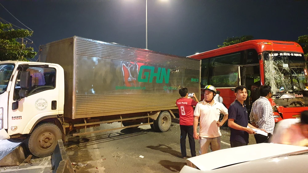 Cú tông mạnh khiến cửa hông xe khách bị xé toạc, phụ xe đứng gần khu vực va chạm nên trọng thương, được người dân đưa đi cấp cứu. Hàng chục hàng khách ngồi trên phương tiện này la hét hoảng loạn. Riêng ô tô tải lệch hướng tông vài dải phân cách bê tông mới dừng lại.