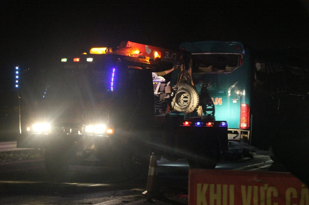 Đến khoảng 2 giờ 20 sáng 22-2, chiếc xe khách được kéo ra khỏi hiện trường. Ảnh: TUYẾN PHAN
