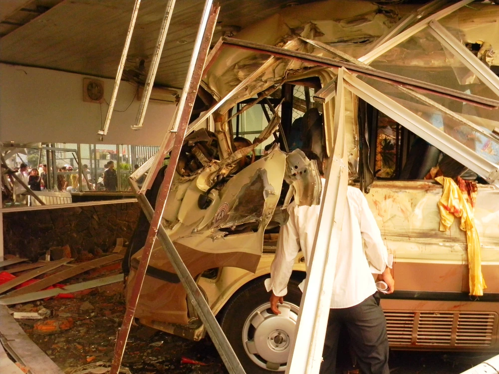 Tại hiện trường cửa sắt, tường của cửa hàng bán đồ gỗ bị xe khách đâm đổ, nhiều mảnh kính vỡ vụn trên mặt đường. Chiếc xe khách nằm lọt trong cửa bán đồ gỗ, đầu bị hư hỏng nặng. Một chiếc xe máy bị kéo lê nằm gần bánh trước bên phải xe khách.