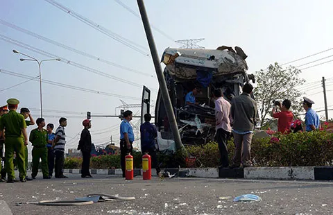 Xe tải biển số 70C-011.04 do tài xế Lê Quốc Thắng (ngụ huyện Tân Châu, Tây Ninh) đang chở khoảng 10 m3 gỗ khi đến giữa giao lộ thì xảy ra va chạm với xe khách giường nằm do tài xế Nguyễn Bá Long (ngụ TP Pleiku, Gia Lai). Cú va chạm mạnh khiến xe khách bẹp dúm phần đầu, lao vào phần đường bên trái và leo lên dải phân cách đâm đổ trụ đèn chiếu sáng. Còn xe tải lật ngang ngay góc đường làm gãy trụ tín hiệu giao thông (ảnh).