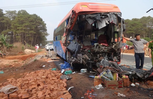 Vụ tai nạn làm tài xế xe khách cùng phụ xe tử vong tại chỗ, hàng chục hành khách cùng tài xế xe tải bị thương nặng, xe khách bị bẹp nát phần đầu. Ảnh: Đại Dũng