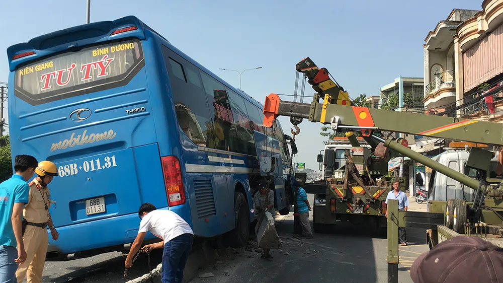 Khi cách cầu vượt Quang Trung khoảng 2 km (phường Tân Chánh Hiệp, quận 12, TP.HCM) thì bất ngờ leo lên dải phân cách bê tông giữa hai làn xe. Sự cố khiến hàng chục người gồm cả trẻ em trên phương tiện này hoảng loạn.