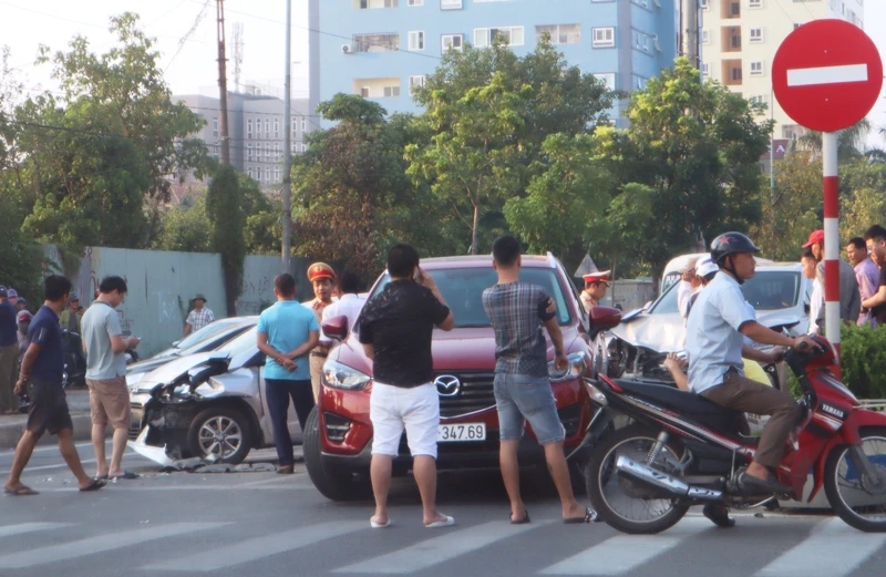Vụ tai nạn xảy ra vào khoảng 15 giờ 30 phút chiều 29- 9, trên đường Mai Hắc Đế (đoạn ngã tư Ga Vinh, TP Vinh, Nghệ An) giữa ba xe ô tô con và hai xe máy khiến giao thông ách tắc.