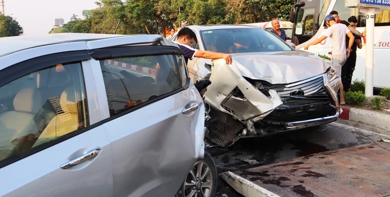 Tại hiện trường, chiếc xe Lexus bị hư hỏng nặng phần đầu nhưng không bung túi khí. Ô tô Hyundai và Mazda hư hỏng.