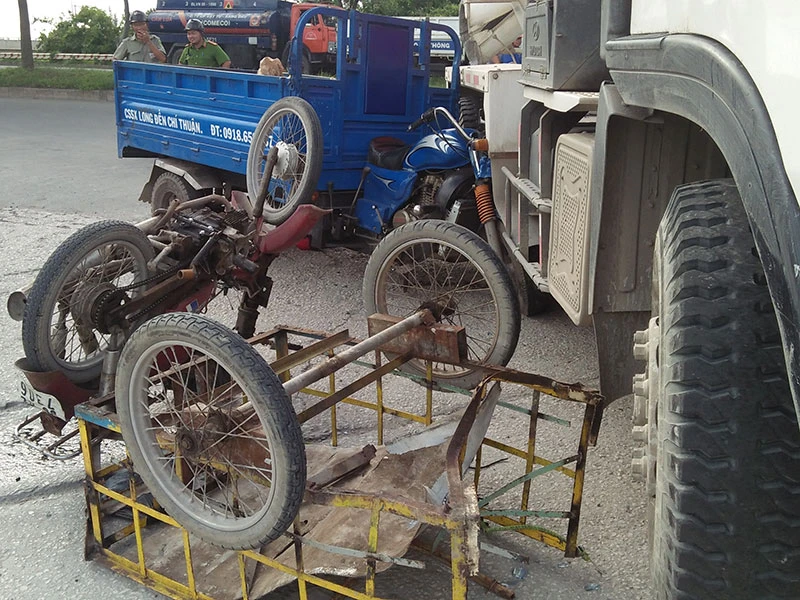Đúng lúc đó, anh Mai Thái Bình (37 tuổi), chạy xe ba gác máy biển số Đồng Nai và anh Nguyễn Thanh Vân (40 tuổi) chạy xe máy lôi tự chế biển số TP.HCM cùng chiều đến, không kịp xử lý để phương tiện lao thẳng xe bồn trộn bê tông.