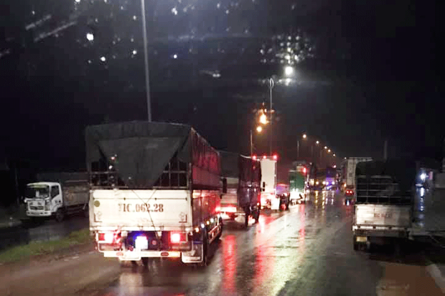 Nhiều phương tiện xếp hàng dài không qua được chốt cầu Rạch Miễu vào rạng sáng 27-9. Ảnh: CTV