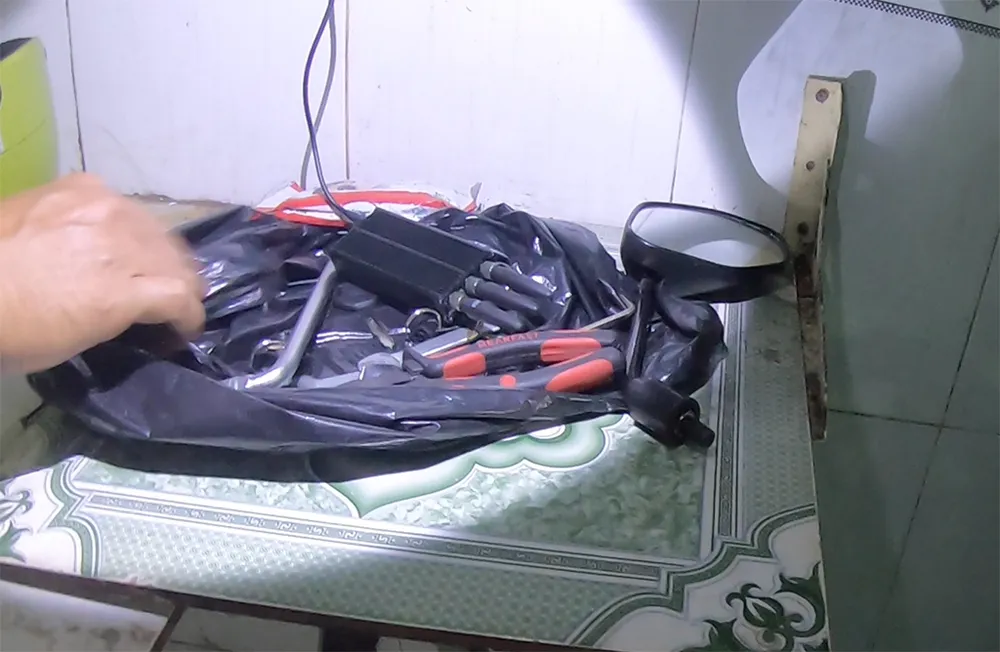 Ngay sau đó, Công an phường Bình Hoà đã có mặt lập biên bản, kiểm tra căn phòng thì phát hiện nhiều thiết bị dùng để phá khoá xe, phá nhiễu định vị, hai biển số xe giả và hai cây mã tấu.