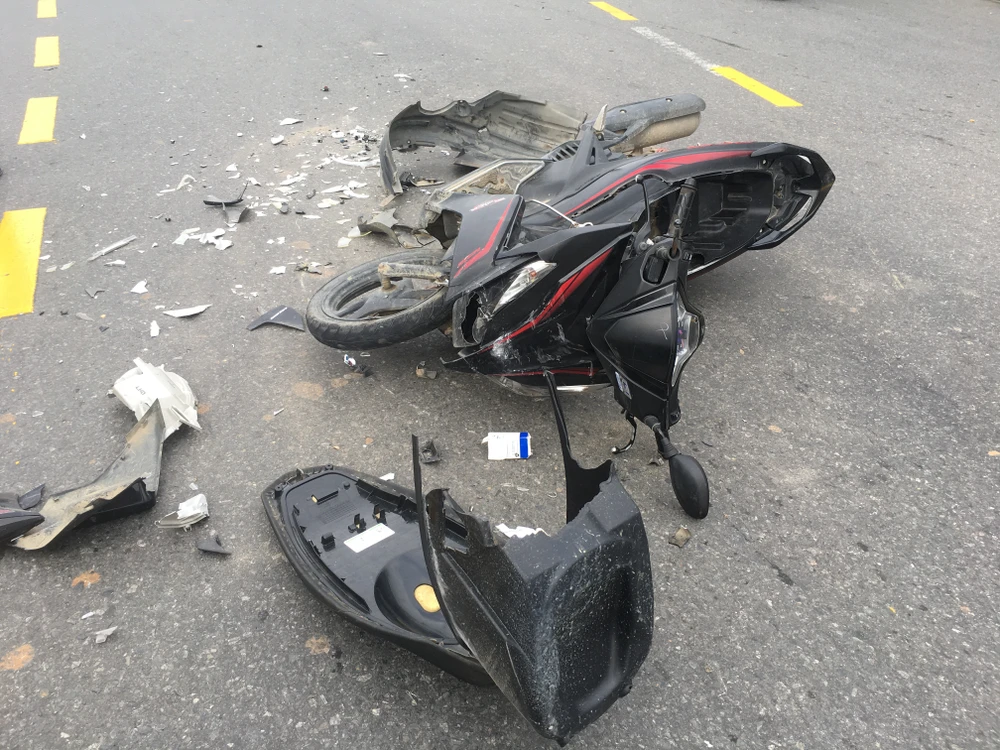 Tại hiện trường, chiếc ô tô bị hư hỏng phần đầu trong khi xe gắn máy bể nát nhiều bộ phận, phần yên xe và đầu xe bị hư hỏng nặng.