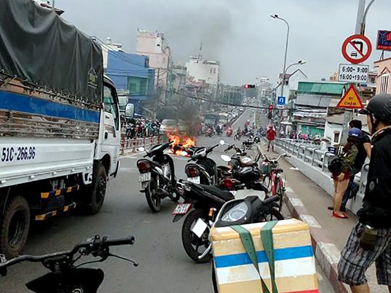 Lửa nhanh chóng bao trùm chiếc xe máy, khói đen bốc lên dữ dội. Những người đi đường sợ xe phát nổ nên tránh xa, đường lên cầu bị ùn ứ.