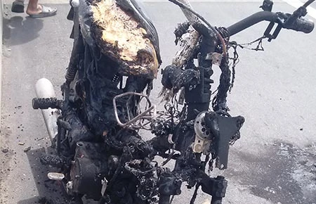 Dù được nhiều người giúp sức dập lửa nhưng chiếc xe máy vẫn bị thiêu rụi. (ảnh).