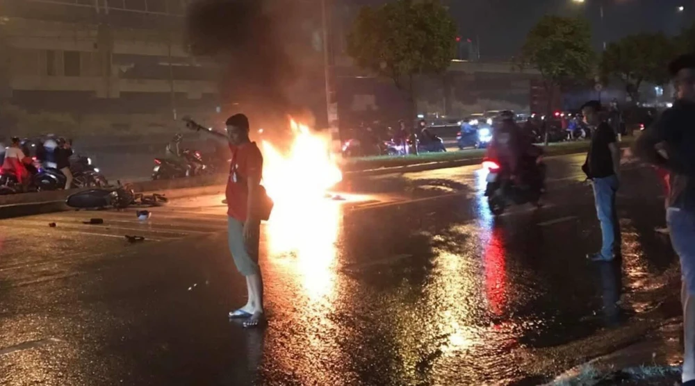 Vụ việc làm xe máy chưa rõ biển số này bốc cháy dữ dội. Rất may, thời điểm xảy ra vụ việc có nhiều người đi đường nên đã kịp thời kéo hai nạn nhân tránh xa ngọn lửa.
