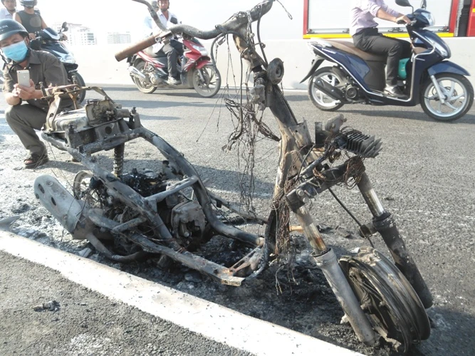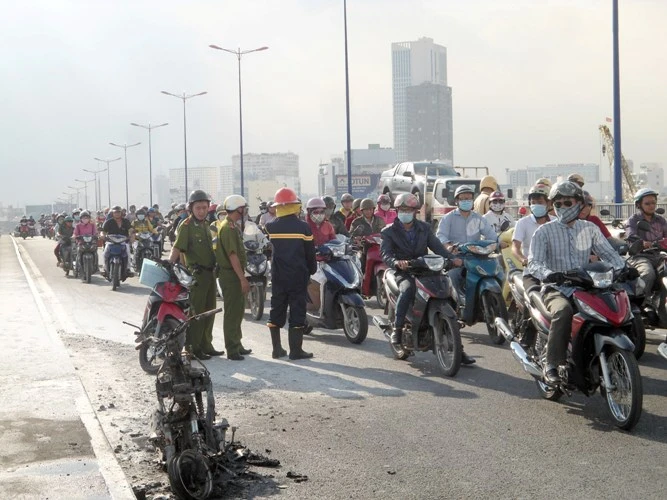 Khoảng 15 giờ chiều 2-11, trên cầu Sài Gòn (Bình Thạnh, TP.HCM), một chiếc xe máy hiệu Attila bất ngờ bốc cháy dữ dội khi đang di chuyển từ hướng Tân Sơn Nhì về BV quận 2.