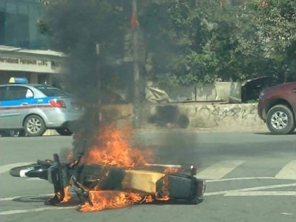 Vào thời điểm trên, chiếc xe máy mang BKS Hà Nội do một nam thanh niên điều khiển đang lưu thông theo hướng Trần Khát Chân đi Nguyễn Khoái thì bất ngờ xuất hiện khói và lửa.