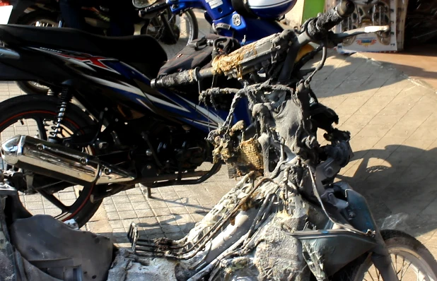 Chiếc xe máy cháy chỉ còn trơ khung. Ảnh: PV
